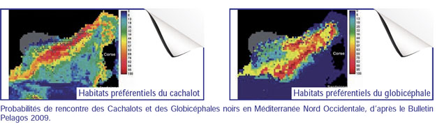 Le trajet proposé pour 2010 et 2011, élaboré en rapport avec les zones qui seront prospectées pour les macrodéchets, coïncident par ailleurs assez bien en Méditerranée Nord Occidentale avec l’habitat préférentiel des espèces dont les comportements sont encore peu connus (Cachalot et Globicéphale notamment), et dont les répartitions estivales ont été récemment modélisées (voir cartes ci-dessous).